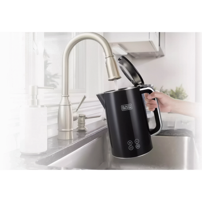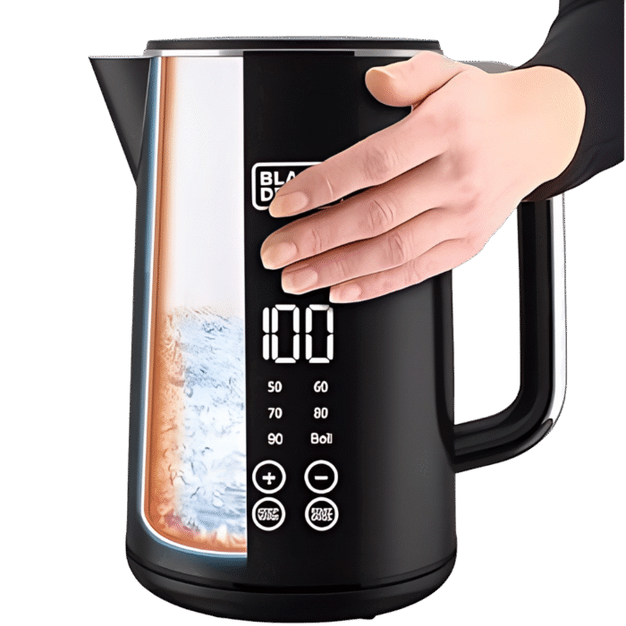 The Black+Decker JCD200-B5 takes boiling water to the next level with digital touch controls and 6 preset temperature settings for tea, coffee, and specialty brews. A 2200 W concealed heating element ensures fast boiling, while the 1.7 L capacity covers family servings. The sleek stainless steel body with a digital LED display provides both durability and a modern look. Safety features include auto shut-off, boil-dry protection, and a cool-touch handle. Additional conveniences like a keep-warm function, one-touch lid, and 360° cordless base make daily use effortless. Backed by an international warranty, this kettle blends precision, style, and power.