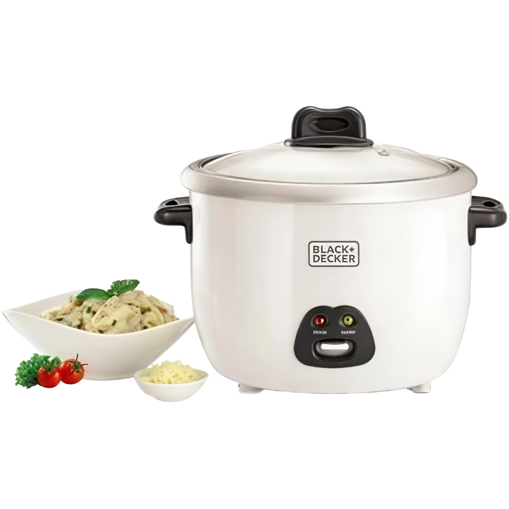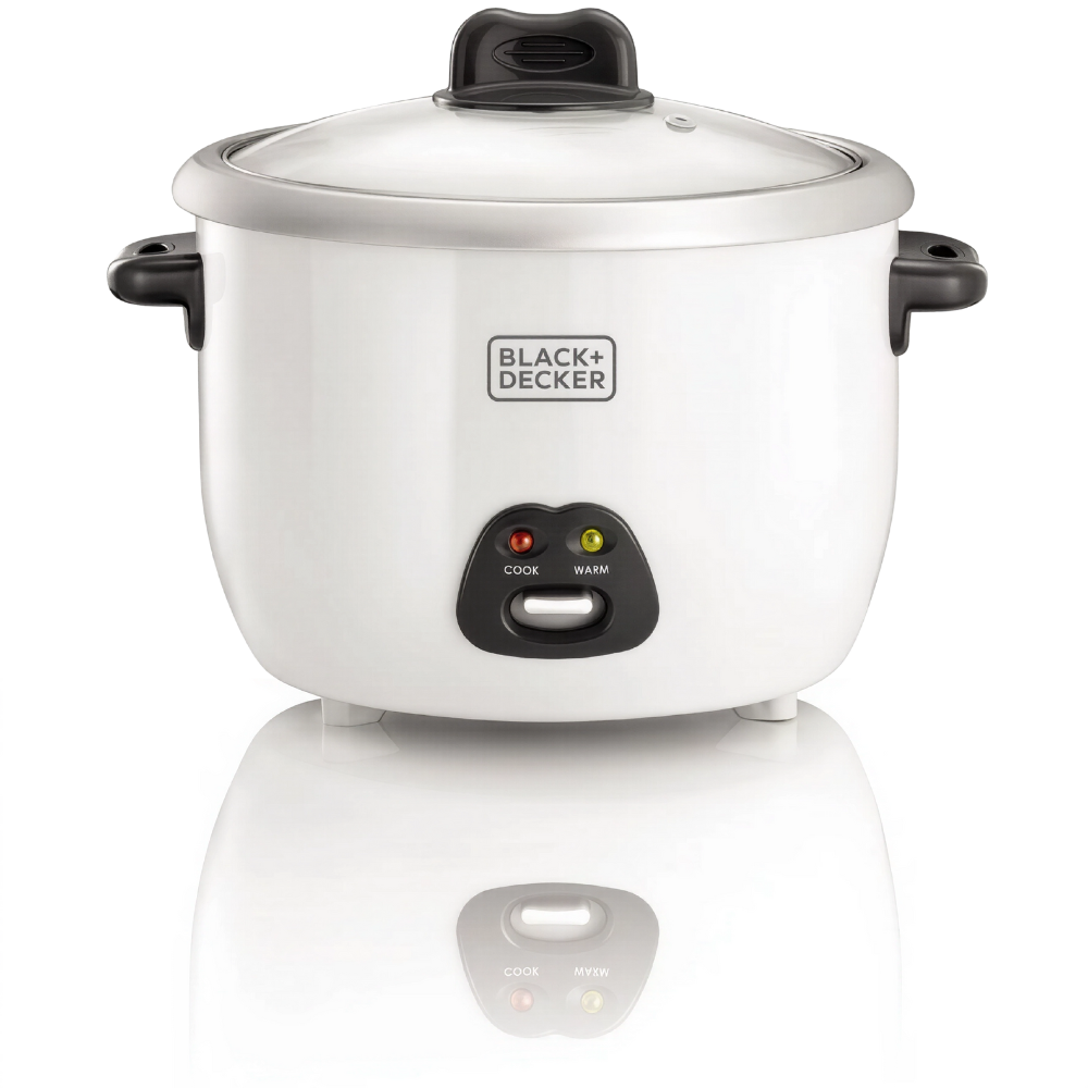 The Black+Decker RC1850-B5-SP is a reliable, family-size rice cooker with a 1.8-liter bowl (up to ≈10 cups cooked). A dependable 588–700W heater powers one-touch Cook / auto Keep-Warm with status lights, while the removable non-stick aluminum bowl shortens cleanup. Use the in-box steaming tray to cook vegetables or fish as your rice cooks below. A tempered glass lid and easy-to-read water-level markings help you monitor and measure accurately. Finished in white and backed by an international warranty, the RC1850 is built for everyday, fuss-free results.
