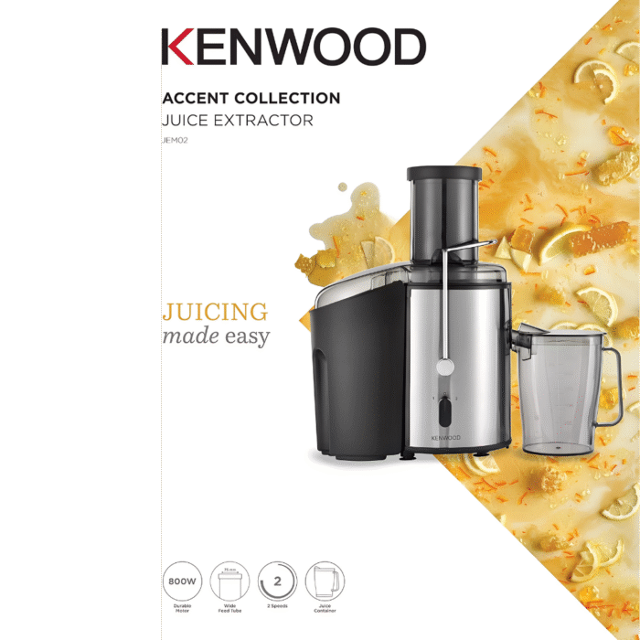 The Kenwood JEM02.A0BK is a sleek, everyday centrifugal juicer built for quick prep and fresh results. A reliable 800W motor and 75 mm wide feed tube handle whole fruits and chunky cuts with less prep. Switch between 2 speeds for soft or hard produce, pour cleanly via the anti-drip spout, and enjoy easy cleanup with dishwasher-safe removable parts. Includes an easy-pour juice jug and a handy pulp container. Finished in Black × Metal accents with an international warranty.
