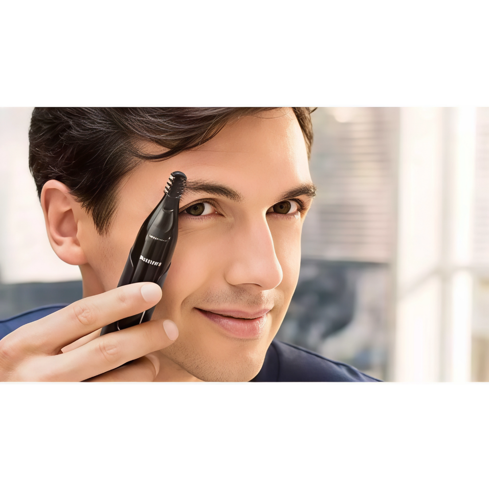 In the Box | Nose/ear/eyebrow trimmer; precision trimmer head; 3 mm & 5 mm eyebrow combs; protective cap; AA battery (varies); user manual |