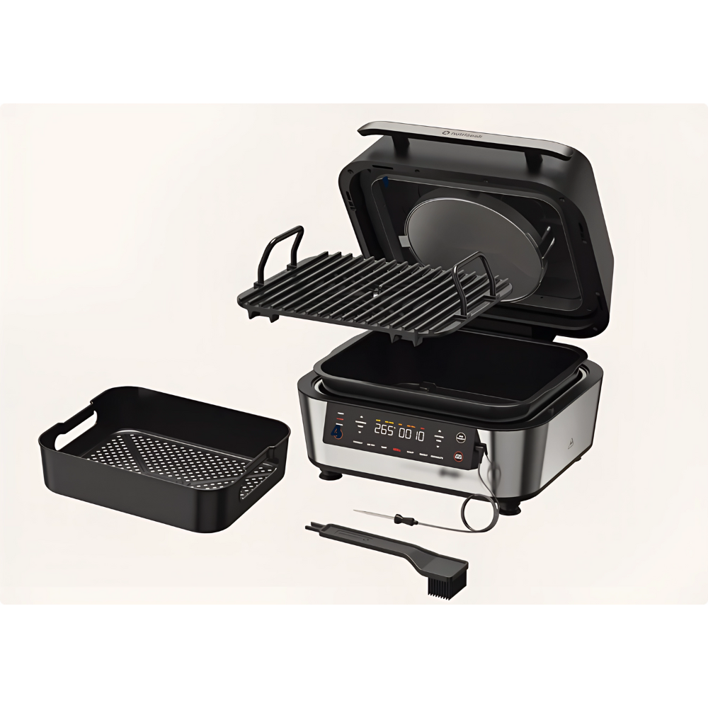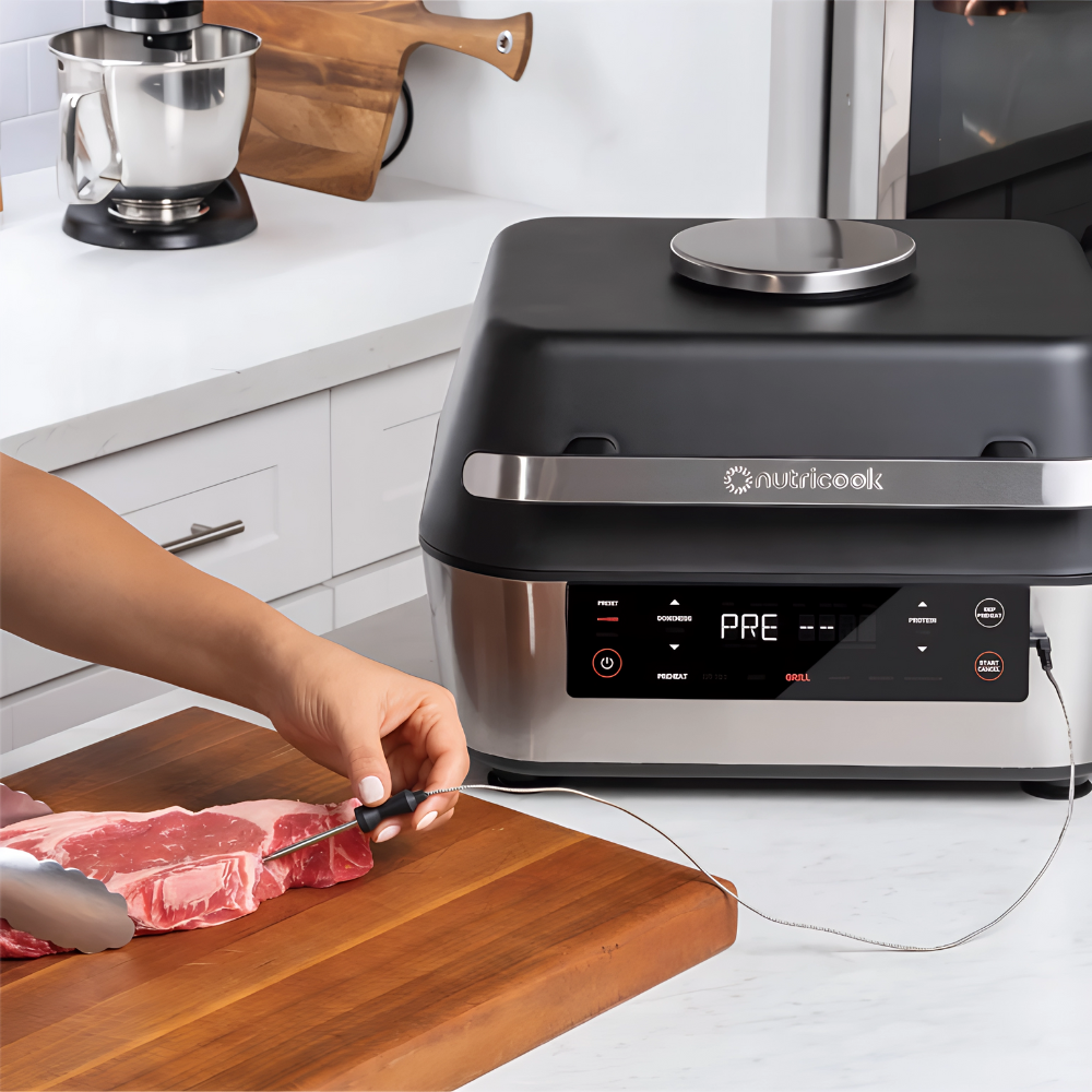 The Nutricook Smart Air Fryer Grill XL AFG960 combines an indoor grill and air fryer with 6 cooking programs. An integrated smart thermometer tracks internal food temperature, while the ~8.5-L pot and 6-L basket handle family-size meals. Powerful ≈1760 W output, ceramic non-stick surfaces, and low-smoke performance round out an easy, versatile cooker.