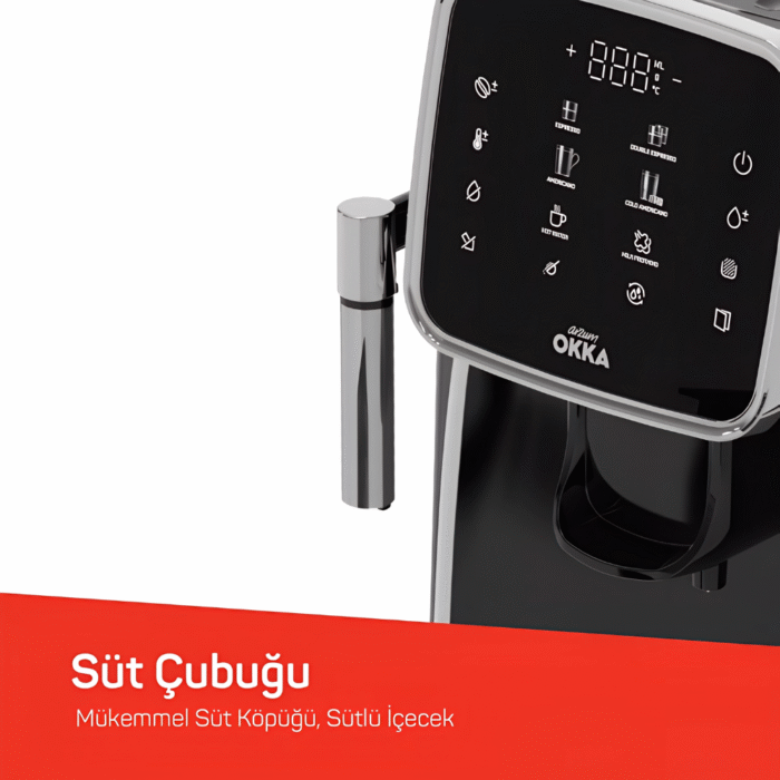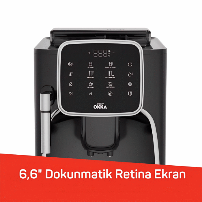 The Arzum Okka Espresso Pro OK0030-05 brings café-style espresso home with a 19-bar pump, powerful 1200–1450W heating, and a generous 1.8-litre water tank. Navigate recipes on the vivid 6.6″ OKKA Retina color touch display. Brew up to 6 one-touch drinks (espresso, double espresso, americano, iced americano, ground coffee, milk foam) and dispense hot water for tea or americanos. A steam/milk wand lets you texture milk to taste, while auto-clean programs simplify daily care. With a 200 g bean hopper, adjustable grind, and sleek black/chrome finish, Espresso Pro fits modern kitchens—and it’s backed by an international warranty.