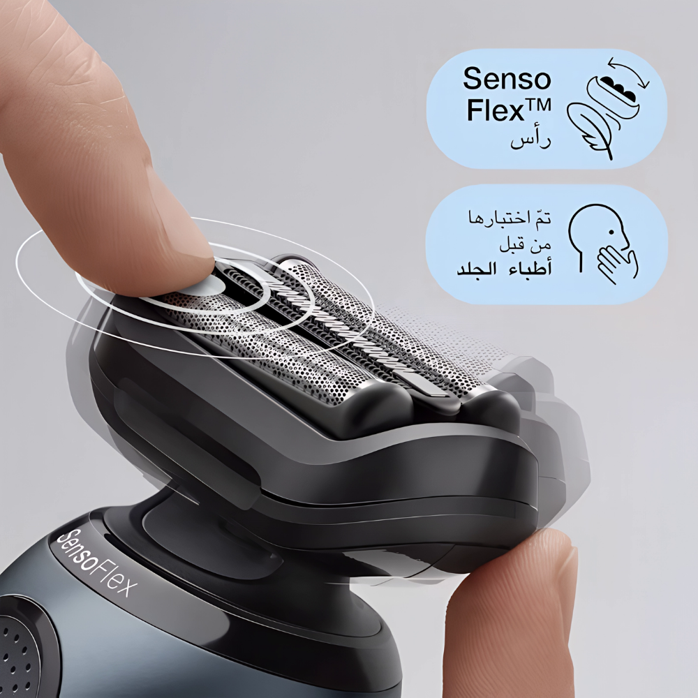The SensoFlex shaving head with dermatologically tested pressure adaptation helps reduce pressure on the skin,