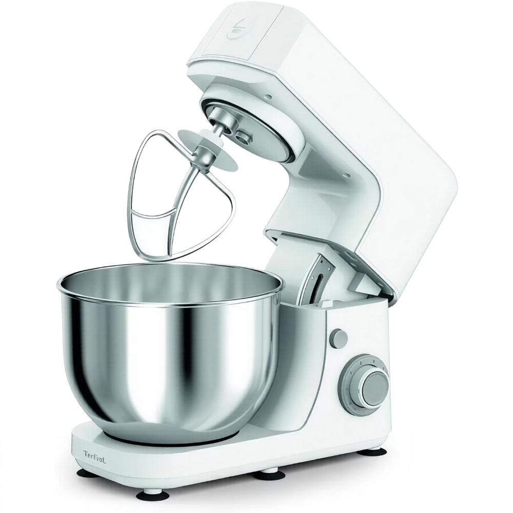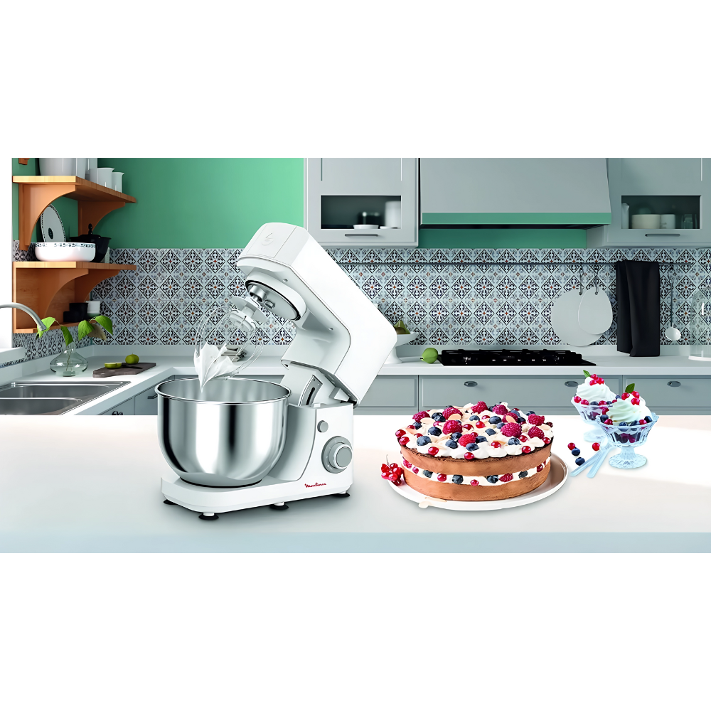 The Moulinex MasterChef Essential QA150110 is a smart home mixer that strikes a balance between compact design and functionality. Powered by an 800 W motor, it efficiently handles everyday mixing, whipping, and dough tasks. Its 4.8 L stainless steel bowl offers generous capacity without occupying too much space. With 6 speeds + pulse, the mixer allows gradual precision control. A tilt-head design ensures ease of tool changes and ingredient additions, while planetary mixing motion ensures consistent blending across the bowl. It includes durable metal attachments—K-beater, dough hook, whisk—and features in a sleek white finish. This model is backed by an official warranty from Moulinex.