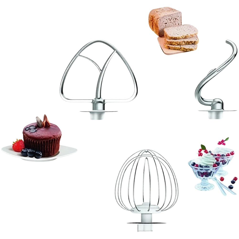 - Included tools: K-beater, dough hook, whisk (metalized).
