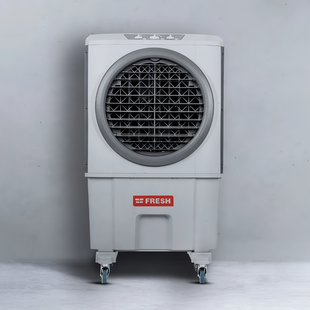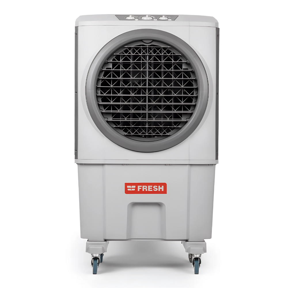 The Fresh FA-M60W is a smart desert cooler with a 60-liter tank and a powerful 16-inch fan. Enjoy 3 speeds, 3-side cooling, automatic air-flow distribution, an anti-bacterial filter, plus a water-level indicator and drain outlet for easy care. Built with low power consumption (≈210 W) and 4 wheels for simple mobility—covered by a 2-year warranty.