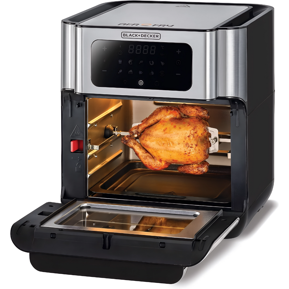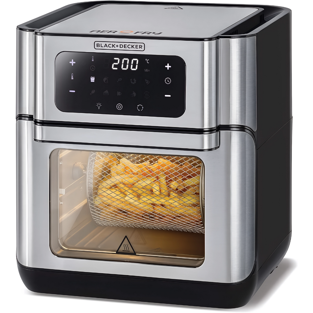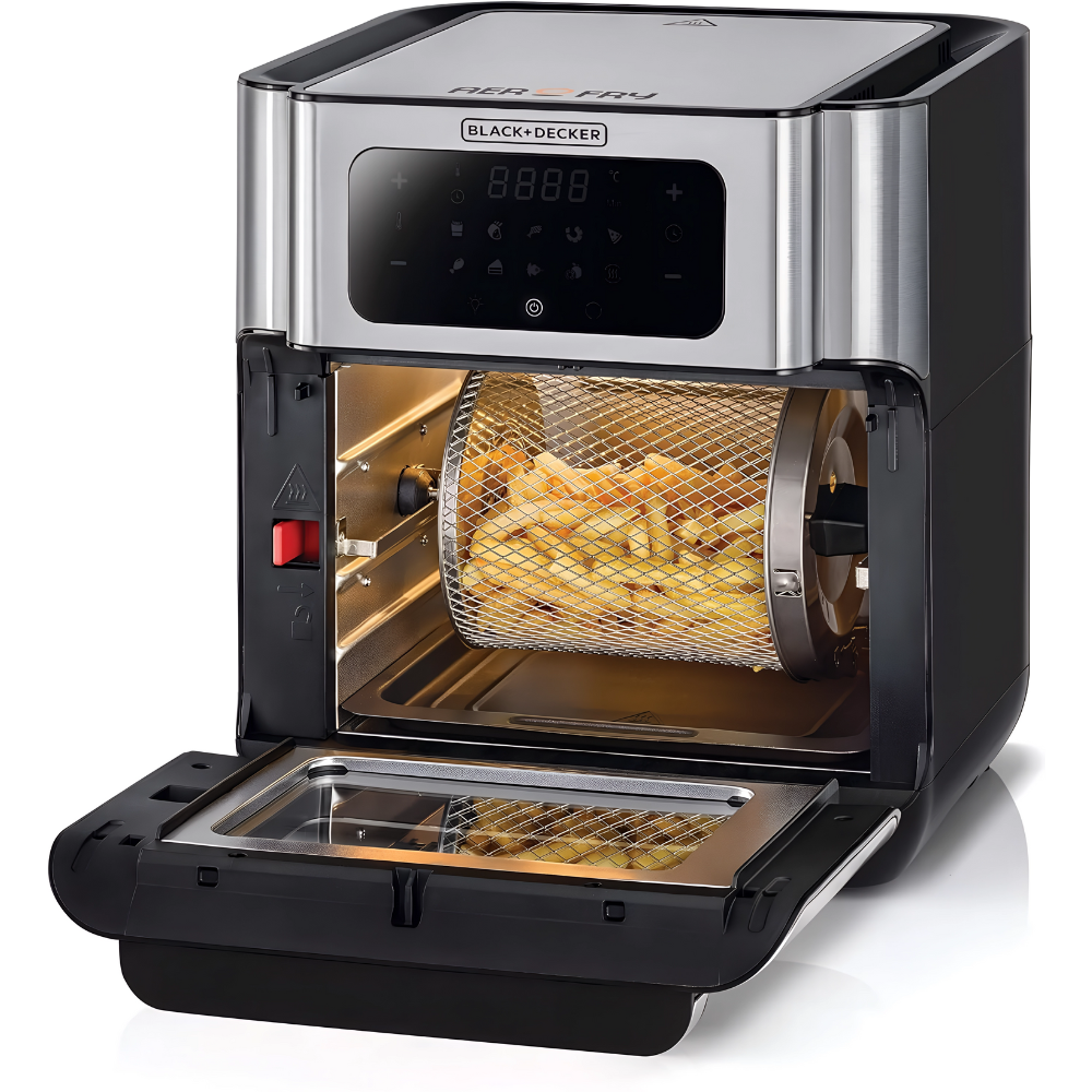 The BLACK+DECKER AOF100-B5 is a spacious 12 L countertop fryer designed to help you cook for the whole family with less hassle. Driven by a dependable 1500 W heating system, it delivers consistent high heat for frying, roasting or baking, while the adjustable thermostat and integrated timer give you control over doneness and texture. A roomy non-stick interior fits generous batches—perfect for fries, wings, schnitzel, vegetables and pastries. The clear viewing window lets you monitor progress without opening the door, and the cool-touch housing plus auto shut-off add everyday safety. Finished in modern silver, AOF100-B5 looks premium yet remains easy to clean, thanks to removable, wipe-clean parts. If you want reliable results, big capacity and straightforward controls on a 220V~50Hz supply, this large fryer is a versatile, family-friendly choice.