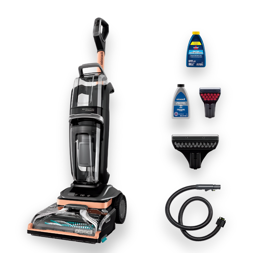 note: Bissell Revolution HydroSteam 3672E, upright carpet & upholstery cleaner with HydroSteam™ technology, 1249W power, three cleaning modes, dual DirtLifter™ PowerBrushes, two-tank system, upholstery & tough stain tools.