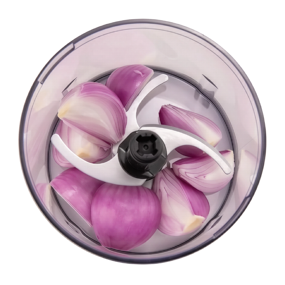 Operation is intentionally simple: a responsive one-touch pulse lets you fine-tune texture—quick taps for a coarse chop, or slightly longer pulses for a smoother blend. The transparent bowl gives a clear view of progress, so you can stop at exactly the consistency your recipe needs. Safety is built in with a lid interlock system that prevents the chopper from running unless the bowl and cover are securely in place. A non-slip base keeps the unit stable, and the wide, ergonomic top provides a comfortable grip for confident, controlled use.