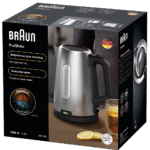 The Braun PurShine WK 1500 brings fast, reliable boiling in a stylish stainless-steel design. Its 2200 W concealed element and Rapid Boil System speed up your routine—boiling about 200 ml in ~45 seconds for a quick cup. The generous 1.7 L capacity covers multiple servings, while the 360° cordless swivel base makes lifting and replacing effortless from any angle. Safety is built-in with auto shut-off and boil-dry protection, and a removable limescale mesh filter helps keep pours cleaner. A clear water-level window, illuminated power switch and integrated cord storage round out daily convenience. Finished in stainless steel / black, the PurShine look complements modern countertops—and it’s backed by an international warranty.
