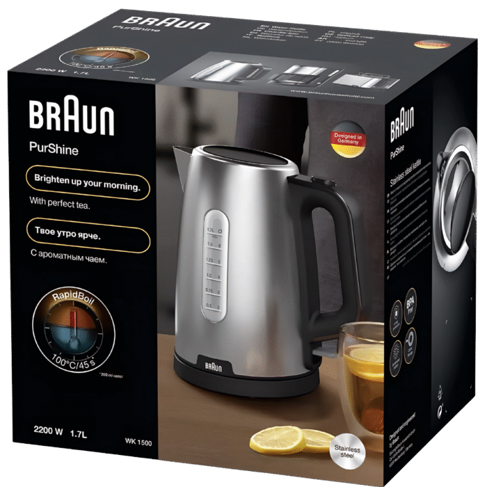 The Braun PurShine WK 1500 brings fast, reliable boiling in a stylish stainless-steel design. Its 2200 W concealed element and Rapid Boil System speed up your routine—boiling about 200 ml in ~45 seconds for a quick cup. The generous 1.7 L capacity covers multiple servings, while the 360° cordless swivel base makes lifting and replacing effortless from any angle. Safety is built-in with auto shut-off and boil-dry protection, and a removable limescale mesh filter helps keep pours cleaner. A clear water-level window, illuminated power switch and integrated cord storage round out daily convenience. Finished in stainless steel / black, the PurShine look complements modern countertops—and it’s backed by an international warranty.
