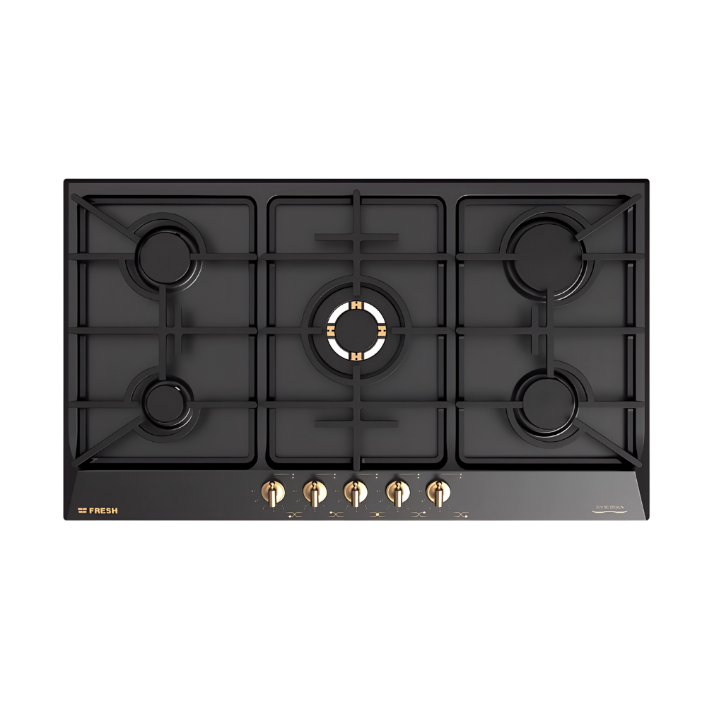- Five-burner layout to handle mains, sides and sauces in parallel on a generous 90 cm surface.