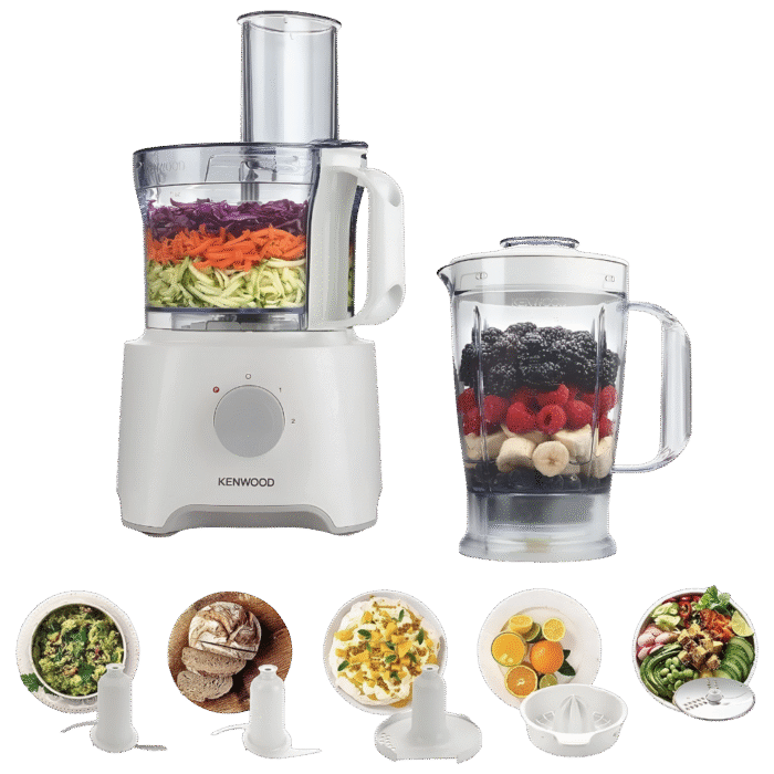 The Kenwood FDP303WH packs everyday power and versatility into a compact footprint that suits smaller kitchens, student flats and busy family counters. Its efficient 800W motor delivers steady torque for slicing vegetables, shredding cheese, whisking dressings and kneading quick doughs—without the bulk or complexity of an oversized machine. The main 2.1 L processing bowl (with an approx. 1.2 L liquid working capacity) is sized for family salads and batters, while the included 1.2 L blender handles smoothies, soups and sauces on the same base. Controls stay simple with 2 speeds + Pulse, letting you burst-pulse herbs and nuts or run continuously for fine, even results. A curated toolset covers the jobs you’ll actually do every day: a stainless-steel knife blade for chopping and mixing, a reversible slicing/shredding disc (ideal for carrots, cabbage and cheese), a dough tool for light breads and pastries, and an emulsifying/whisk disc for whipped cream and mayonnaise. Thoughtful touches—BPA-free food-contact parts, dishwasher-safe components (non-electrical) and a compact plastic body with tidy cord storage—keep cleanup and storage hassle-free. With interlock safety and non-slip feet, the FDP303WH is designed for confident daily use. Finished in a clean look with multicolor accents (white body with grey/transparent parts), it blends easily into modern kitchens. If you want a reliable, no-nonsense processor that handles the most common prep tasks with minimal fuss—and backs it all with an international warranty—Kenwood’s FDP303WH is a smart, space-saving pick.