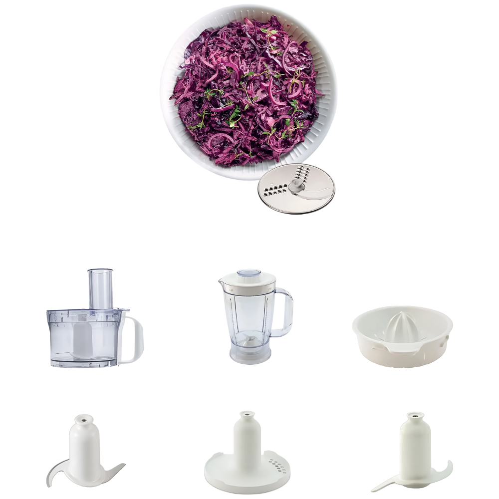 - 1.2 L blender attachment for smoothies, soups and sauces on the same base.