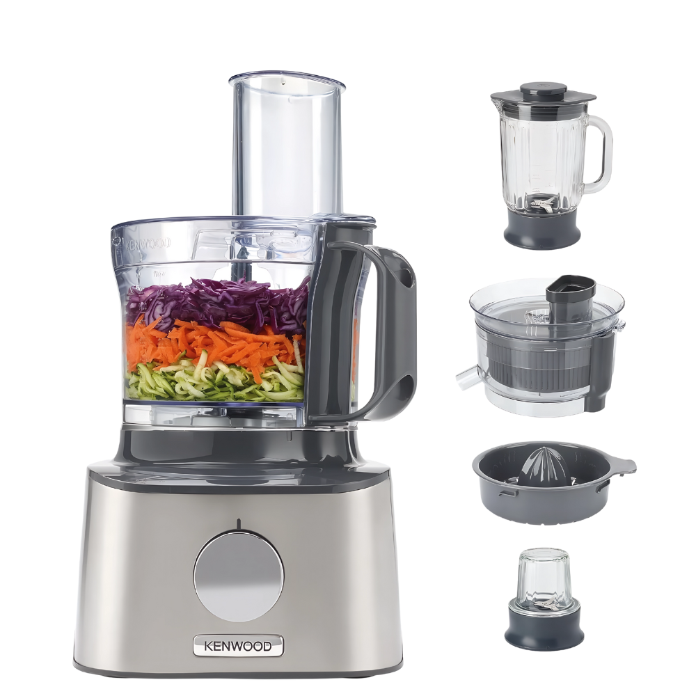 Meet the compact workhorse for busy kitchens. The Kenwood MultiPro Compact FDM307SS packs everyday versatility into a sleek silver body with an efficient 800W motor that keeps pace with chopping, slicing, grating, whisking and even light dough kneading. Its family-friendly 2.1 L bowl (approx. 1.2 L working capacity) handles salads, batters and slaws, while the included 1.2 L glass blender is perfect for smoothies, soups and sauces right on the same base. For spices, coffee beans and nuts, switch to the dedicated grinder mill to get fine, even results in seconds. Operation is refreshingly simple with 2 speeds + Pulse: tap Pulse to control texture precisely, or let continuous speed deliver smooth purées and uniform shreds. The accessory bundle is curated for real-world cooking—stainless-steel knife blade for chopping and mixing, reversible 2 mm / 4 mm slicing & grating discs, a dough tool for pastry and pizza bases, and a whisk/emulsifying disc for creams and dressings. You’ll also find a handy citrus press for fresh orange or lemon juice without reaching for a separate gadget. Clean-up is easy: food-contact parts are BPA-free, most components are dishwasher-safe (non-electrical), and the base sits secure on non-slip feet with a safety interlock to prevent accidental starts. With compact dimensions that don’t crowd the counter and cord storage to keep things tidy, the FDM307SS replaces a shelf of single-purpose tools—backed by an international warranty for added peace of mind.