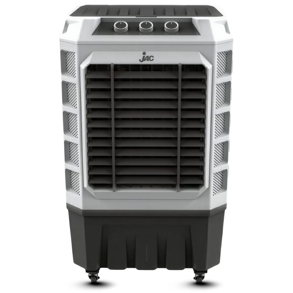 The JAC NGAC-290 is a high-capacity 90-liter desert cooler for hot, dry weather. It delivers up to ≈5500 m³/h airflow with a 10 m air throw, 3 fan speeds, and swing + 4-way air deflection to spread cool air widely. Daily ease includes an anti-dust filter, water-level view, sturdy wheels and efficient ≈250 W power draw (water use ≈ 3–4 L/h). Finished in White × Black and covered by a 2-year warranty.