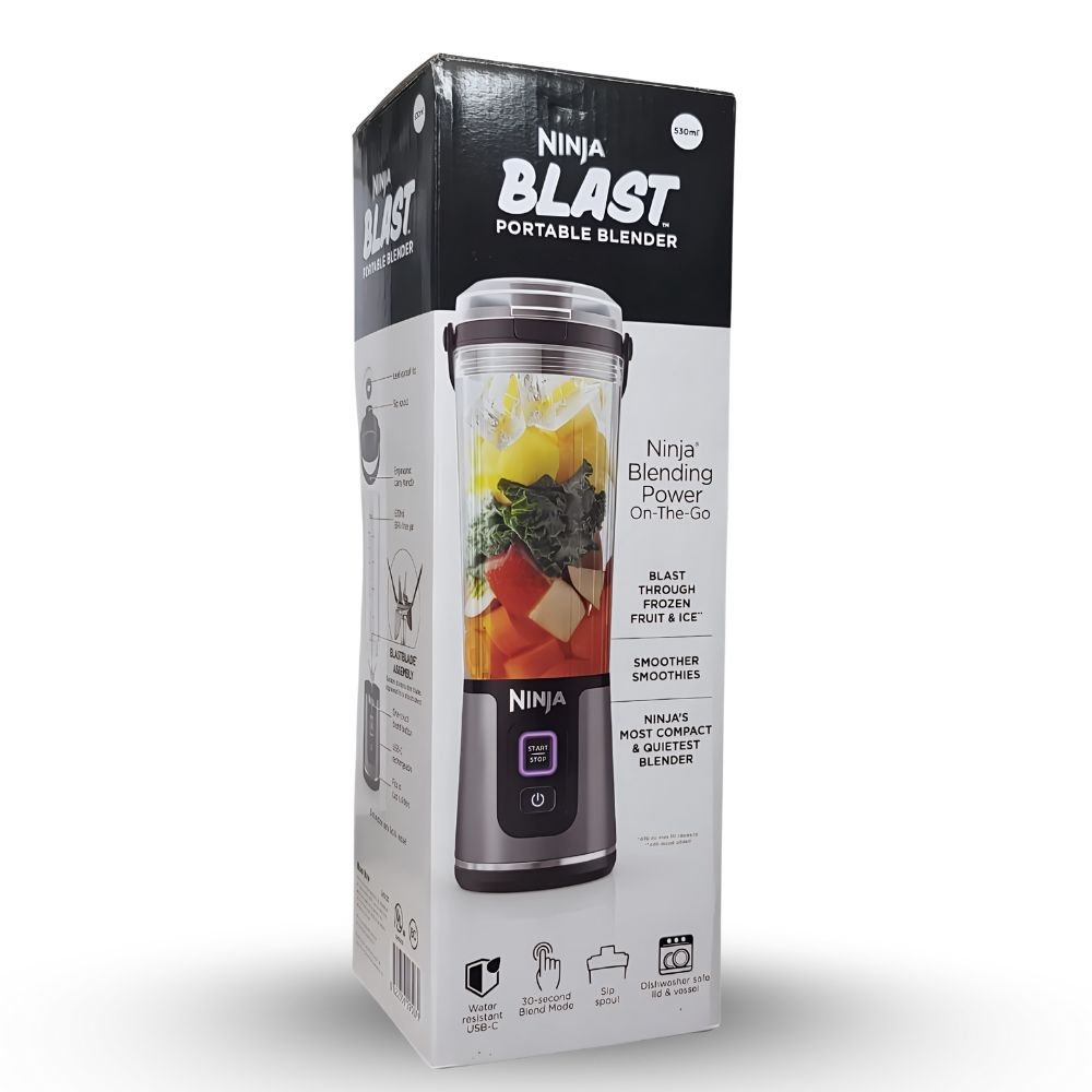 The Ninja Blast™ BC151 brings on-the-go blending with a cordless, rechargeable design. Its stainless-steel BlastBlade™ assembly tackles ice & frozen fruit inside an 18 oz (≈ 530 ml) vessel. One-touch control uses a single Auto program for consistent results, while the hinged carry handle and easy-open sip lid let you blend, twist & drink from the same cup. Parts are BPA-free and dishwasher-safe, and charging is via USB-C—backed by an international warranty.