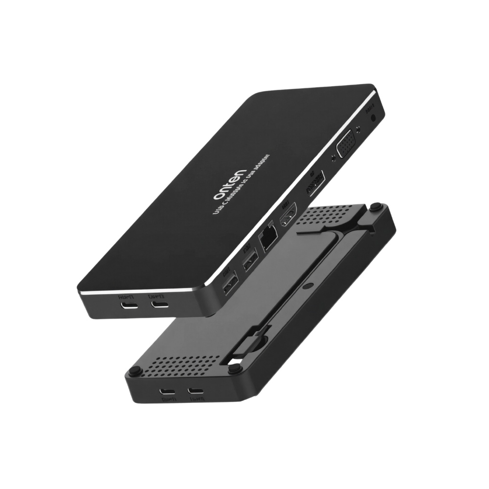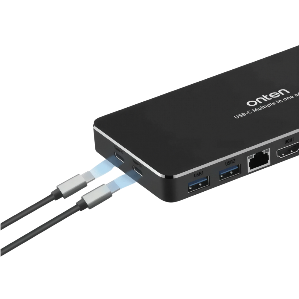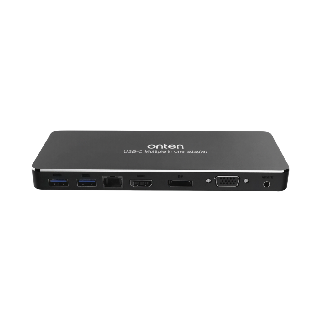 Streamline your desk and expand your laptop or tablet with the ONTEN OTN-9188S, a 9-in-1 USB-C docking station that delivers the ports you need for modern workflows without the cable clutter. From 4K HDMI and 4K DisplayPort to legacy VGA 1080p, you can connect projectors, TVs and monitors in classrooms, meeting rooms and studios with crisp, reliable output. A Gigabit RJ45 Ethernet port provides low-latency wired networking, while USB 3.0 ×2 handles high-speed peripherals such as SSDs, webcams and capture devices. You also get a USB-C (data) port for newer accessories, an upstream USB-C PD input to keep your device powered from the same hub, and a 3.5 mm audio jack for calls and monitoring. Housed in a compact aluminum shell with a 150 mm host cable, OTN-9188S is ideal for hot-desking, hybrid work and travel—one hub to display, connect and charge.