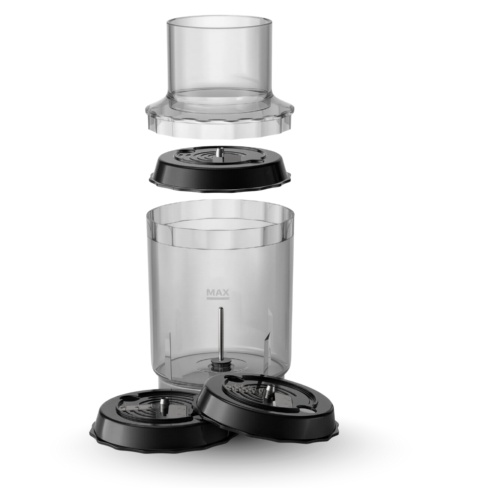 AccessoriesBPA-free beaker (~1 L); whisk & XL chopper; spiralizer/to-go tumbler (bundle-dependent)