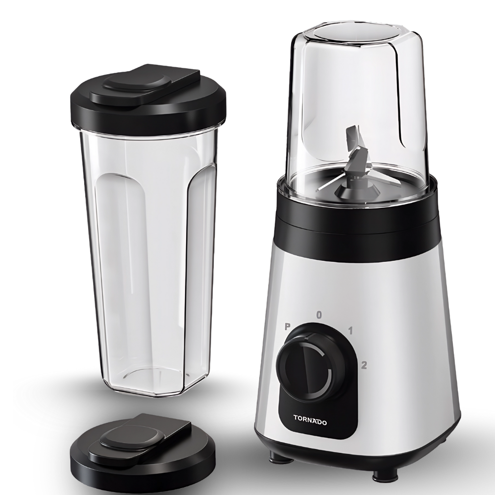 The Tornado PB-320T is a grab-and-go personal blender made for fast shakes and travel convenience. A capable 320W motor spins a stainless-steel blade for smooth blends in the 0.6 L bottle, and the included 0.3 L extra jar is ideal for quick mixes or ice-crushing with short Pulse bursts. Simple 2 speeds + Pulse give you easy control, while stainless-steel housing accents and a non-slip base add durability and stability. Lightweight parts are easy to clean—backed by a 1-year warranty.
