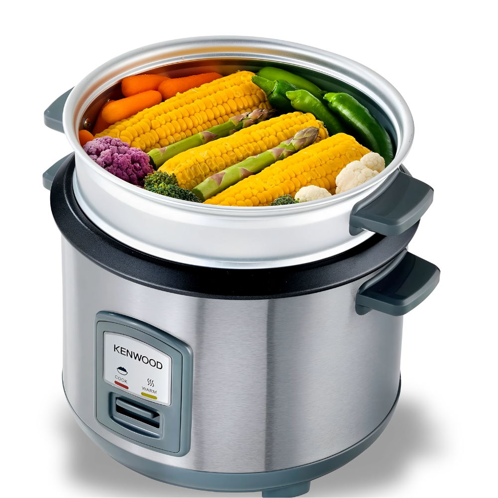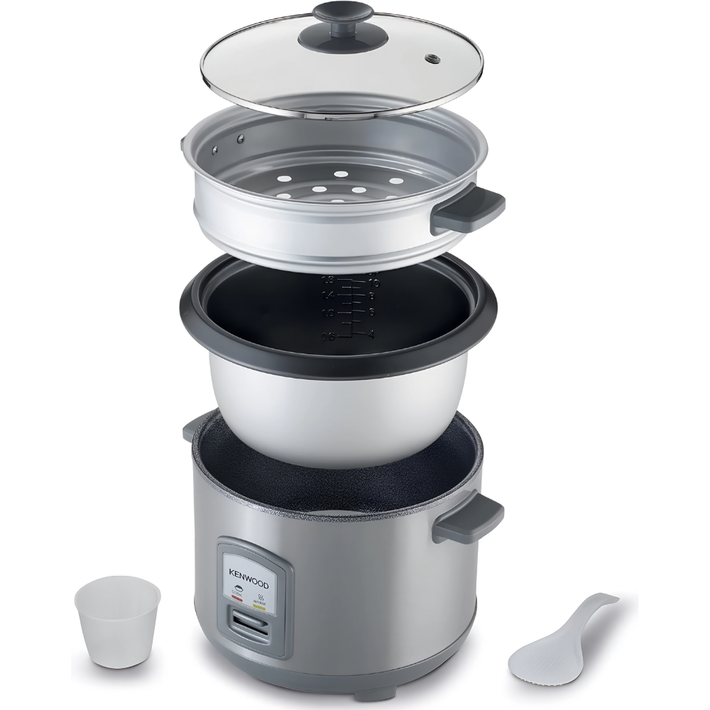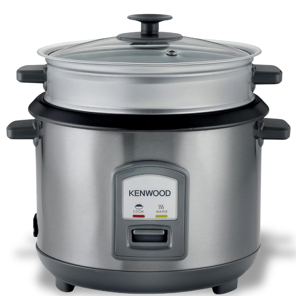 تمنحك كينوود RCM71.000SS سعة ٢٫٨ لتر (حوالي ≈١٢–١٦ كوب حسب معيار الكوب) مع تسوية متوازنة بقدرة ١٠٠٠ وات. تعمل بضغطة واحدة ثم تتحوّل إلى إبقاء دافئ تلقائيًا. تحتوي على قدر داخلي غير لاصق قابل للإزالة، وغطاء زجاجي مقوّى، وسلة بخار للخضروات أو السمك، ولمبات Cook/Warm مع مقابض عازلة للحرارة وهيكل ستانلس ستيل.