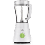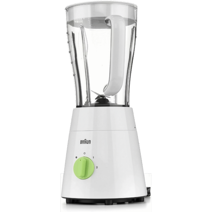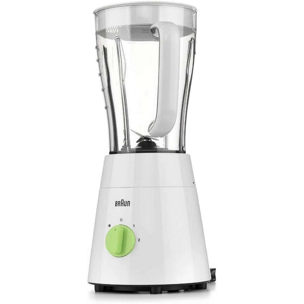 براون JB0115WH – ٥٠٠ وات، دورق ١٫٥ لتر (حد أقصى ≈١٫٧٥ لتر)، نظام ٤ شفرات – أبيض/أخضر
