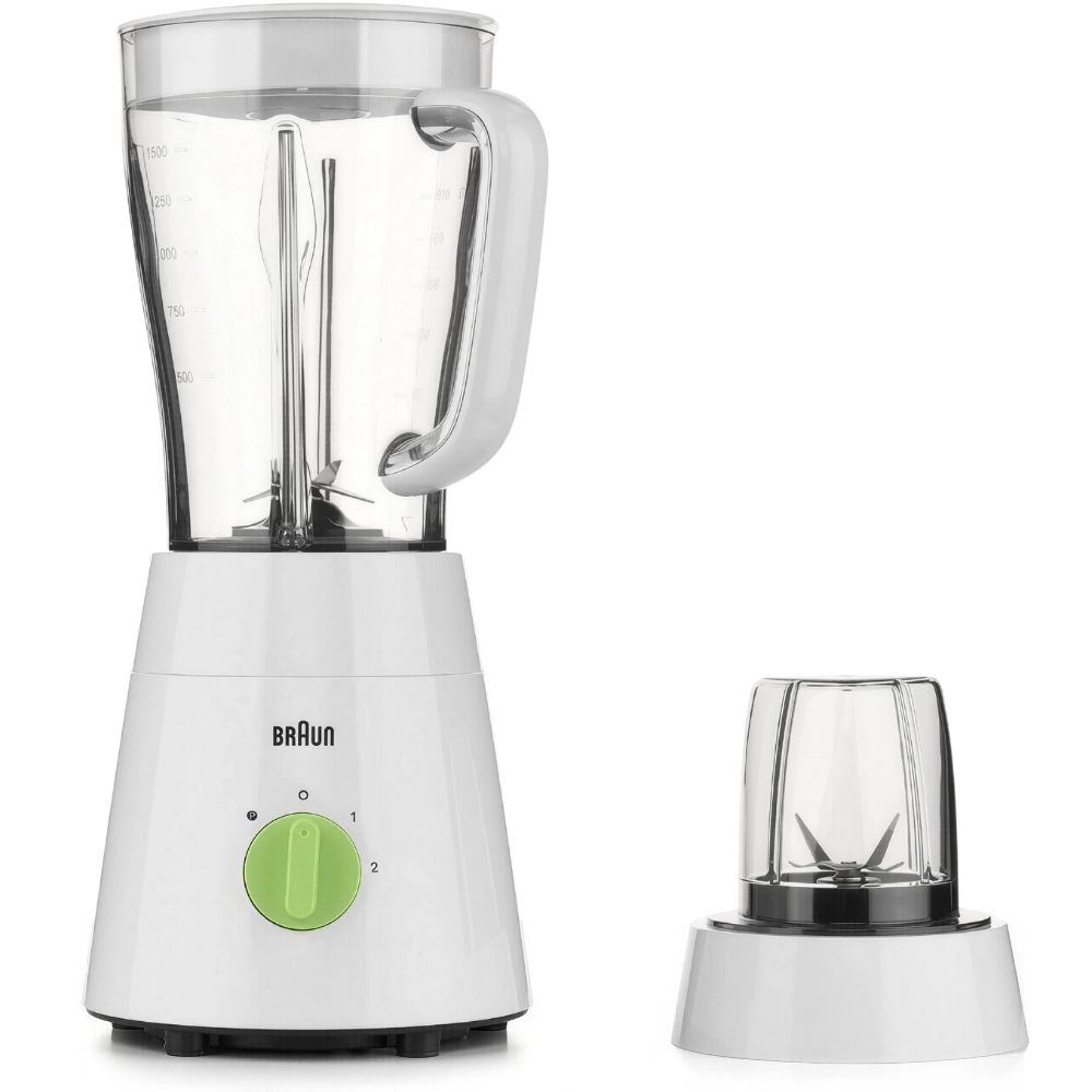 خلاط 2 في 1 براون – 500 واط – 1.5 لتر – سرعتان + وظيفة نبض – 4 شفرات – أبيض/أخضر – (JB0115WH)