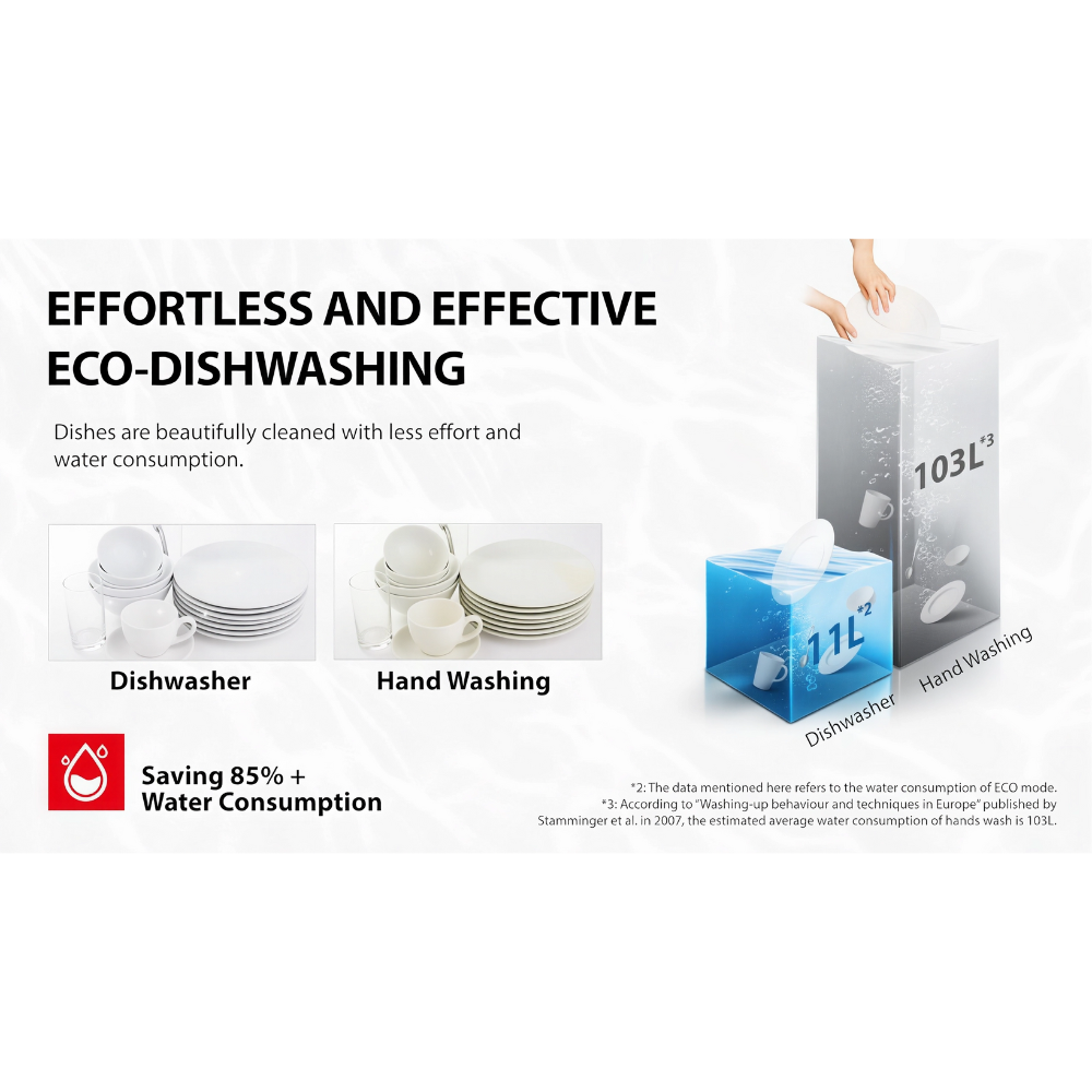 ميزة إضافية: فتحة الباب التلقائية تقلّل التكثّف على الأواني وتسرّع التجفيف—ومع وضع Half Load تقدر تغسل كميات قليلة باستهلاك أقل.