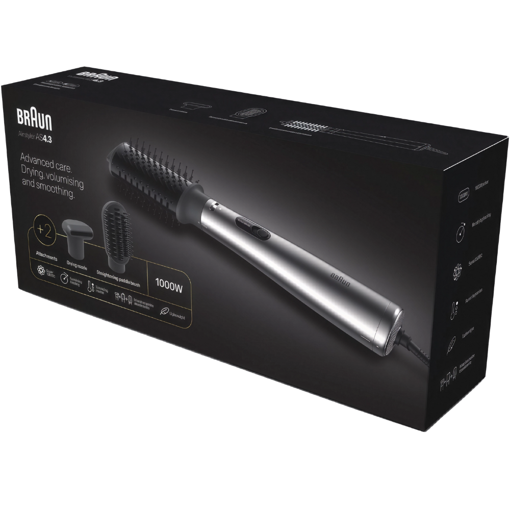 امنحي شعركِ لمسة صالون كل يوم مع فرشاة تصفيف الهواء براون BRAS430E. يعمل محرّك ١٠٠٠ واط على توليد تدفّق هواء مركّز لتجفيف أسرع وتشكيل أدق، بينما تساعد تقنية سوبر آيونتيك على تقليل الكهرباء الساكنة والتجعد لتعزيز اللمعان والنعومة. يسهّل التبديل بين ٣ أوضاع للتصفيف الانتقال من تجفيف تمهيدي سريع إلى إضافة حجم عند الجذور ثم تشكيل الأطراف بانسيابية. ومع التصميم الخفيف المتوازن يقل إجهاد الذراع أثناء الجلسات الطويلة، كما يتيح الرأس البارد تثبيت الخصلة والتحكم بالقرب من فروة الرأس بأمان.