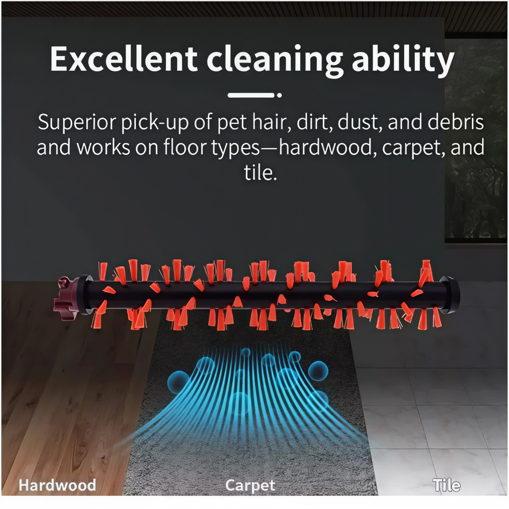 تتعامل الفرشاة مع الأرضيات الصلبة المحكمة الإغلاق مثل السيراميك والباركيه والفينيل، بالإضافة إلى السجاد والمشايات قصيرة الوبر، مما يجعلها مثالية للتنظيف اليومي للمساحات المتنوّعة.