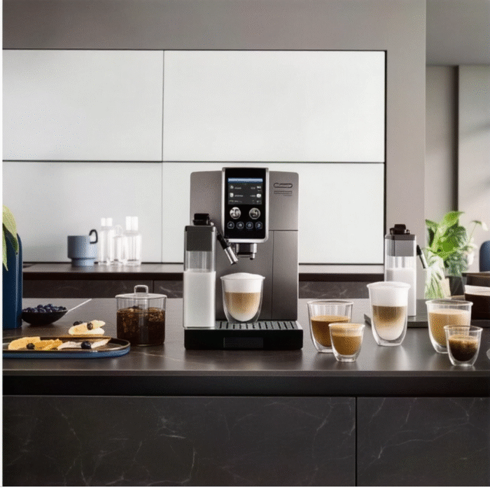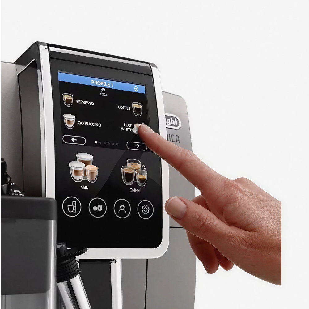 تقدّم De’Longhi Dinamica Plus ECAM380.95.TB تجربة إسبرسو متكاملة بفضل شاشة لمس ملوّنة 3.5″ مع 4 بروفايلات لحفظ الإعدادات، ونظام LatteCrema Hot لرغوة حليب ناعمة وتنظيف تلقائي للكاراف. تصل إلى 24 مشروباً بنقرة واحدة، مع قدرة 1450 وات ومضخة 15 بار وخزان ماء 1.8 لتر وحاوية بن تقارب 250 جم. تصميم تيتانيوم/أسود أنيق وأجزاء سهلة التنظيف (الكاراف آمن للغسالة). يشمل ضماناً دولياً.