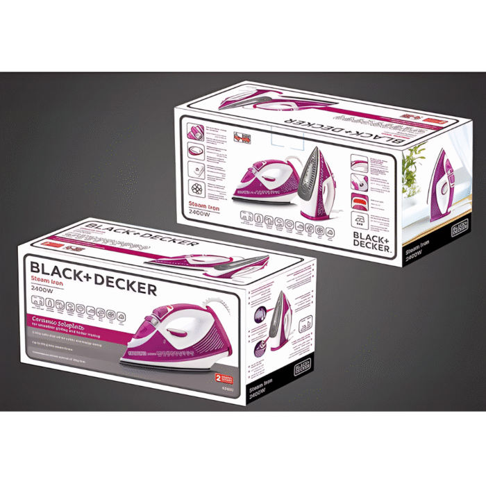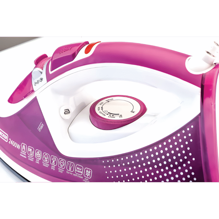 ملاحظة: مكواة بخار بلاك+ديكر X2450‑B5 بقدرة ٢٤٠٠ وات ونعل سيراميك مع إيقاف تلقائي ووظائف مضادة للتنقيط والتكلّس وتنظيف ذاتي.